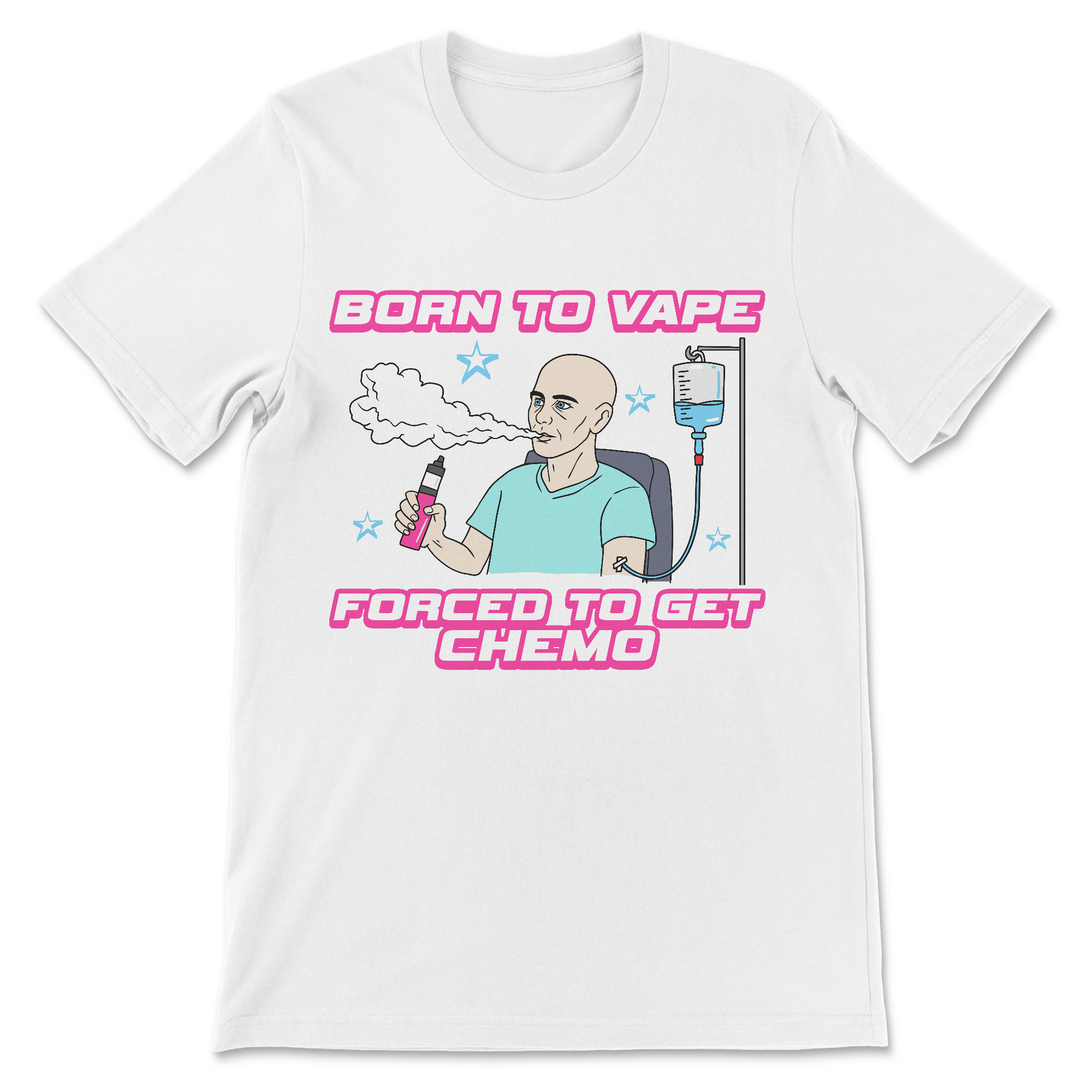 This shirt is just a bald dude on chemo ripping a vape like it's his last one. No deep meaning, no redemption arc—just the dumb, ugly truth of being hooked on clouds while the IV drips. It's not clever or inspirational; it's for when you want the conversation to end before it starts.