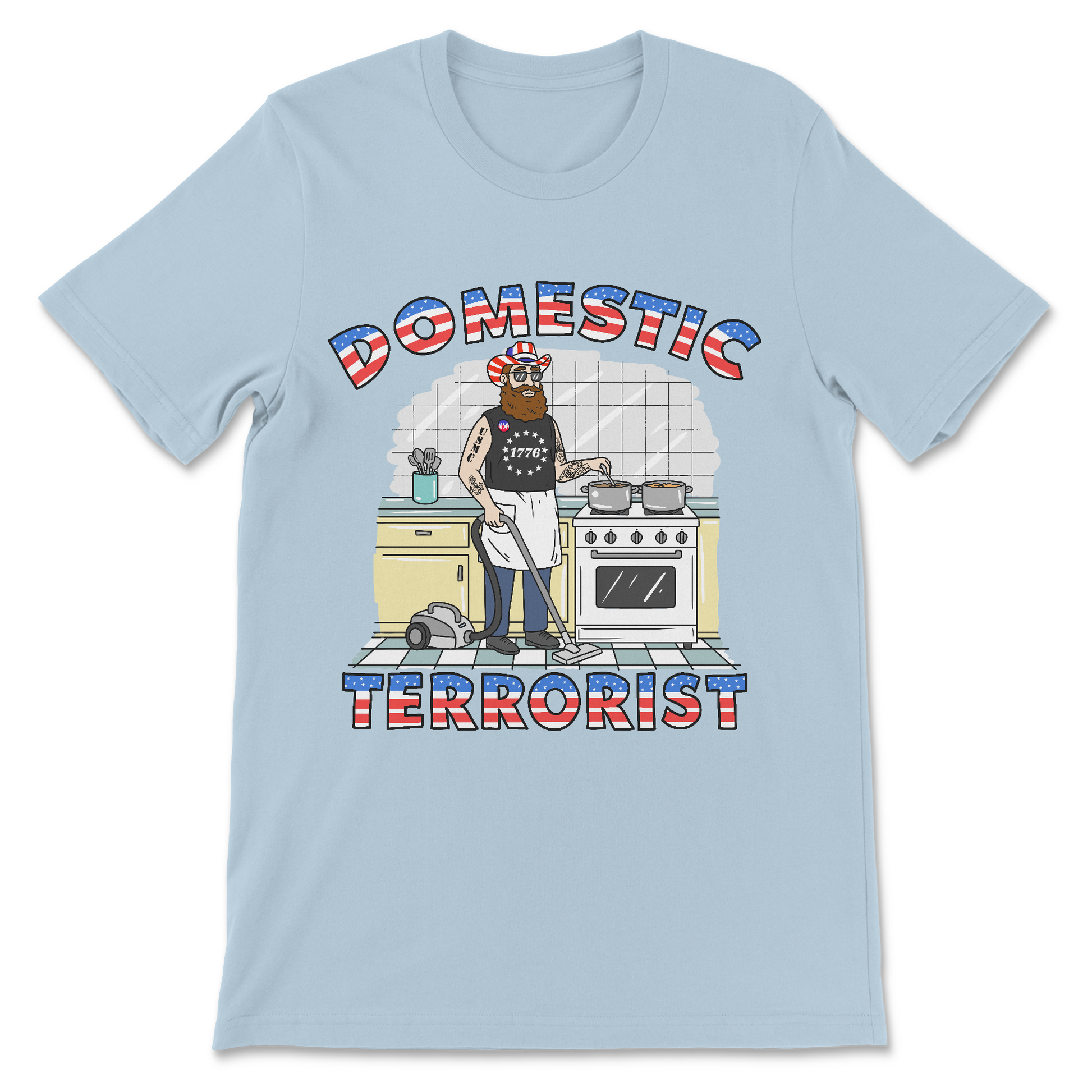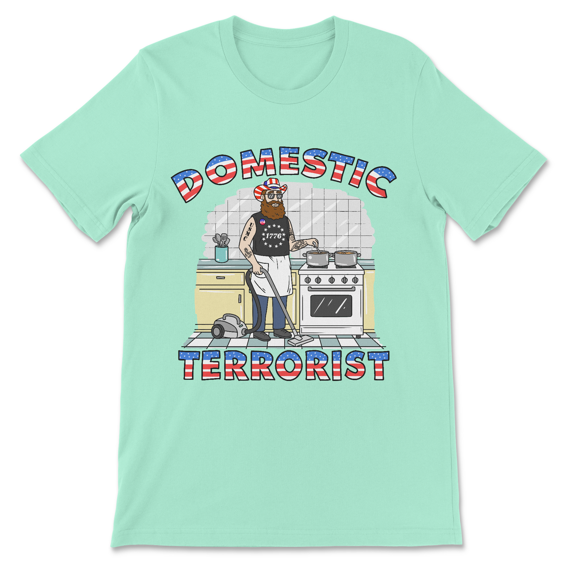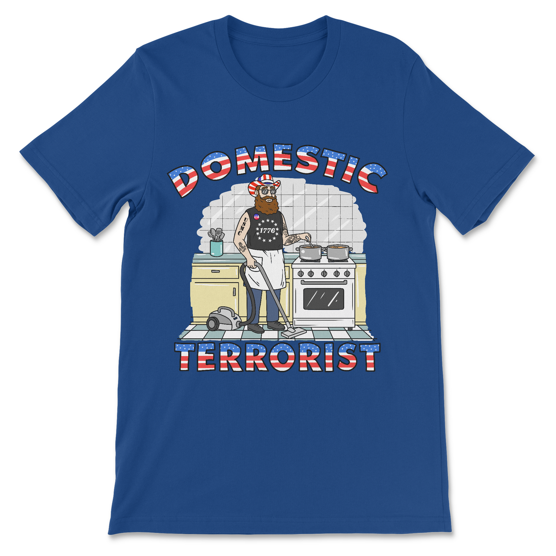Domestic Terrorist flips the script with dark political satire, pairing a MAGA guy in full housewife mode for maximum cognitive dissonance. It’s an offensive meme shirt meant to make everyone equally uncomfortable.