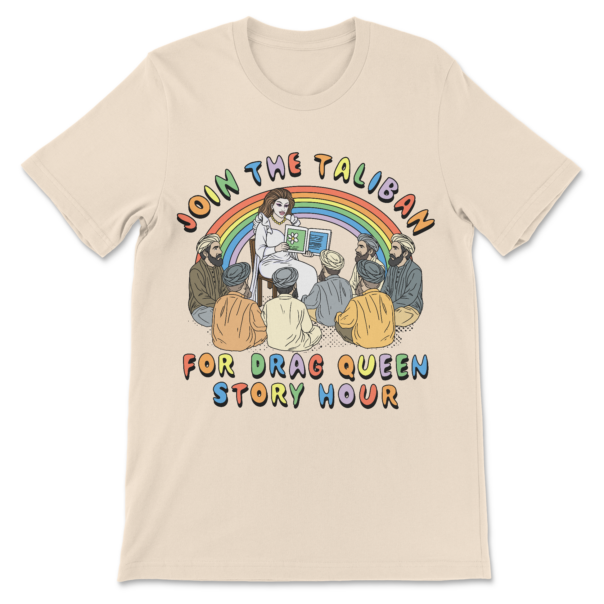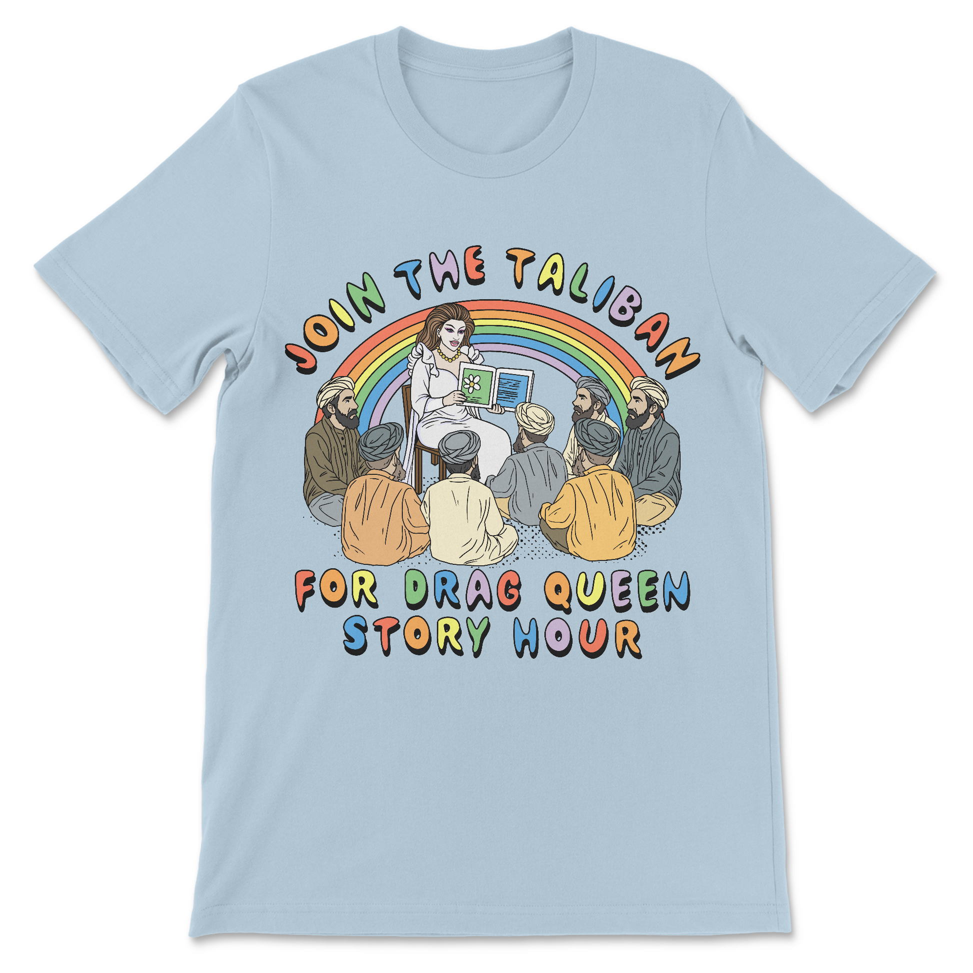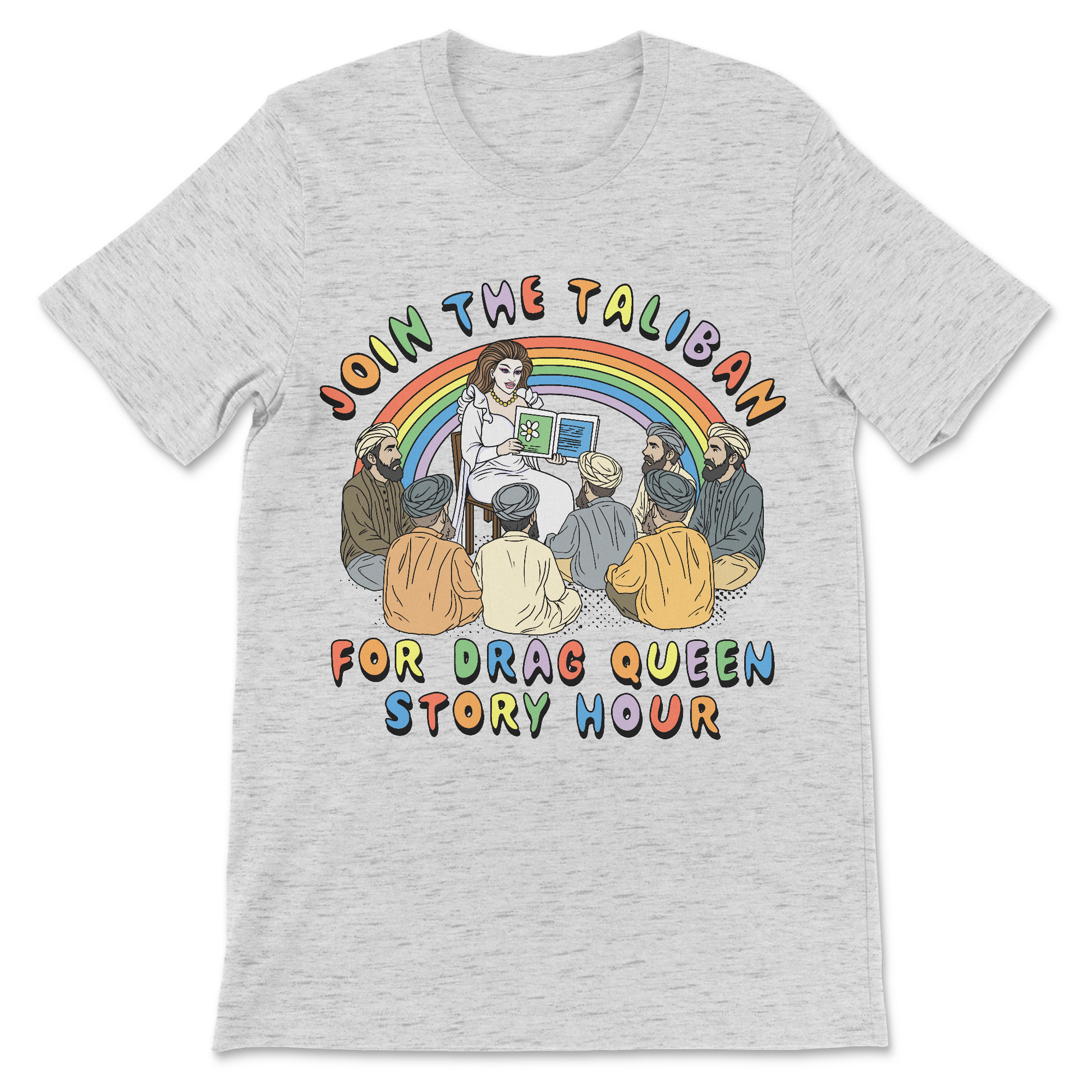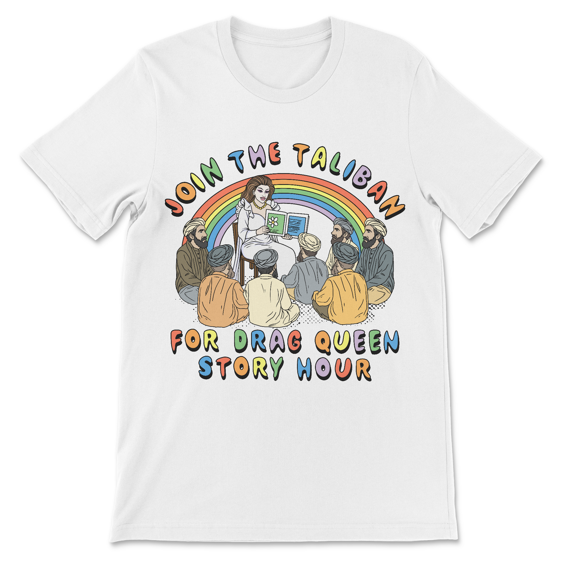 Join the Taliban for Drag Queen Story Hour is the ultimate political satire shirt. A confusing, offensive dark humor tee blending religious extremism and drag shows...if this doesn’t get you cancelled, nothing will.