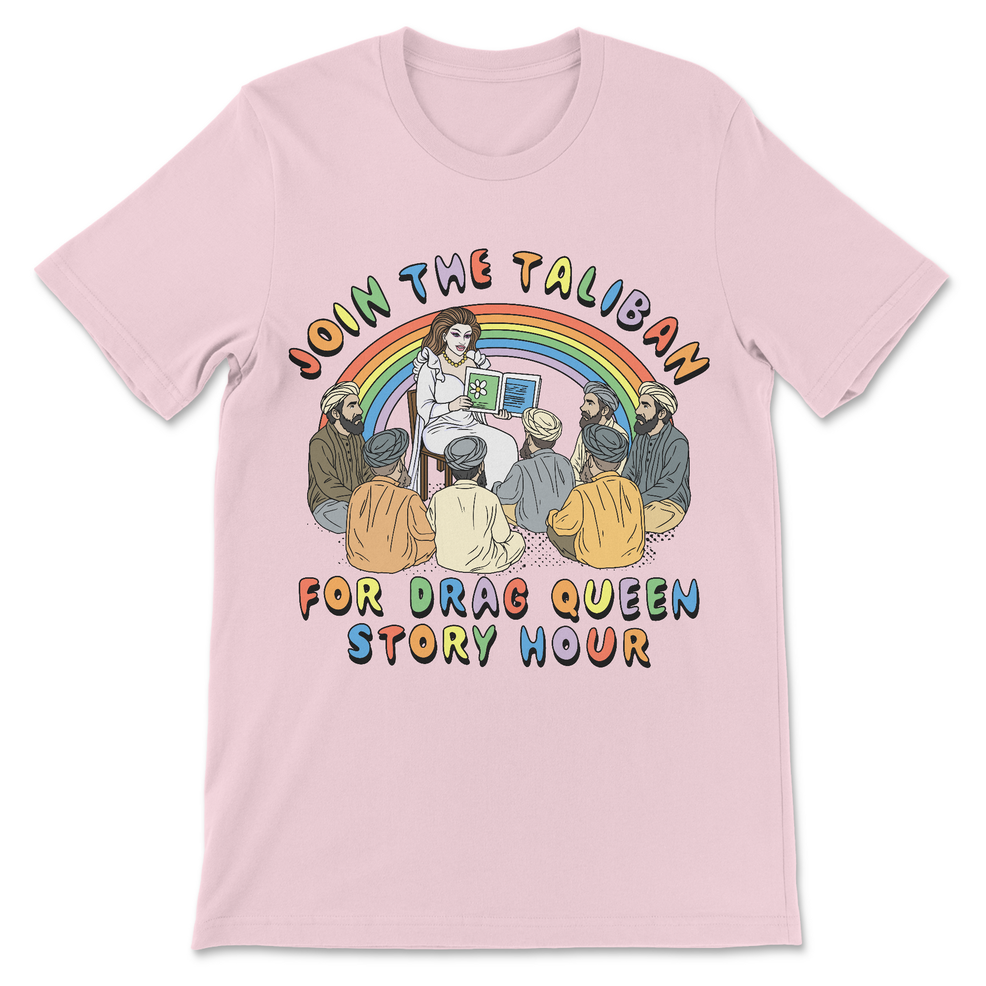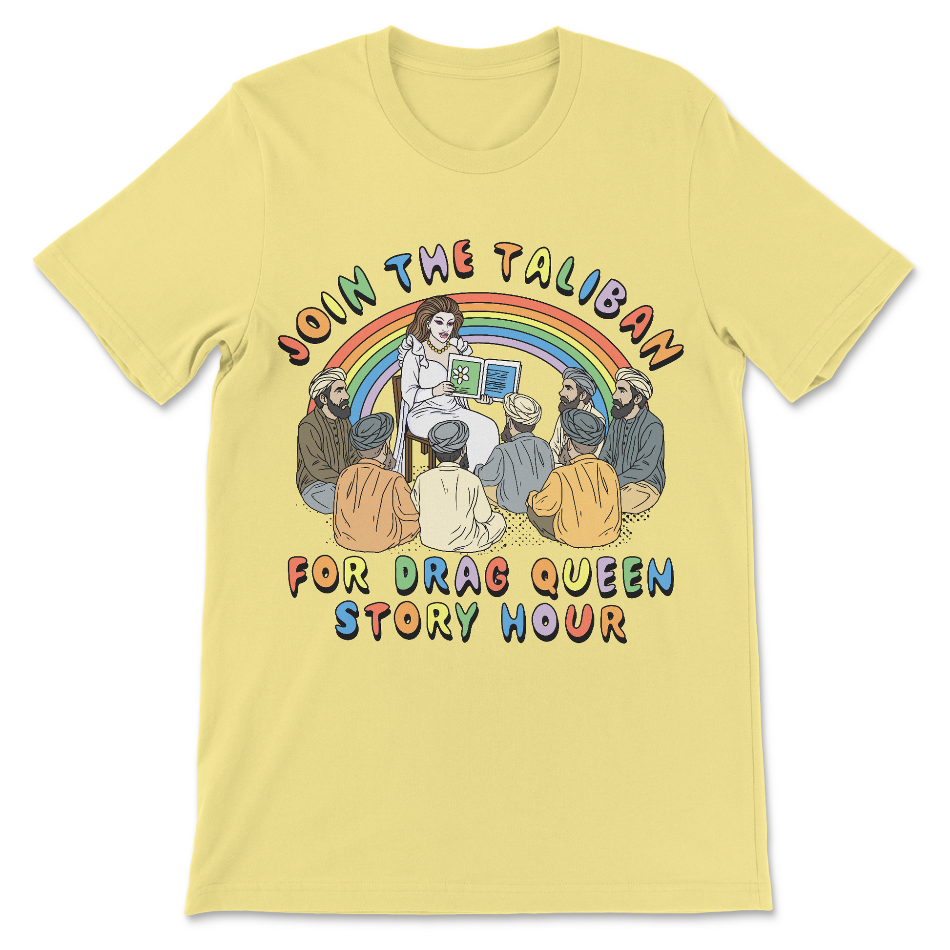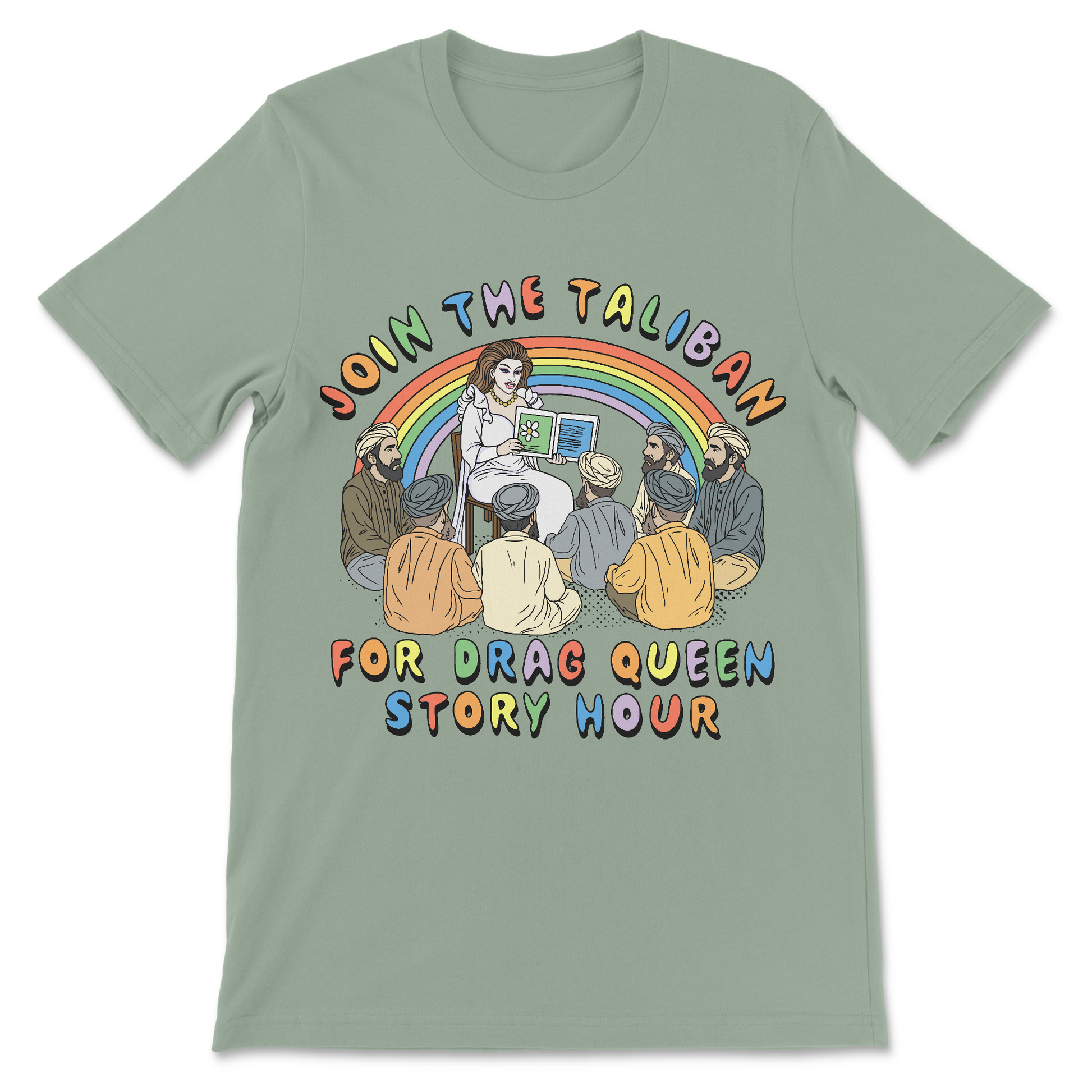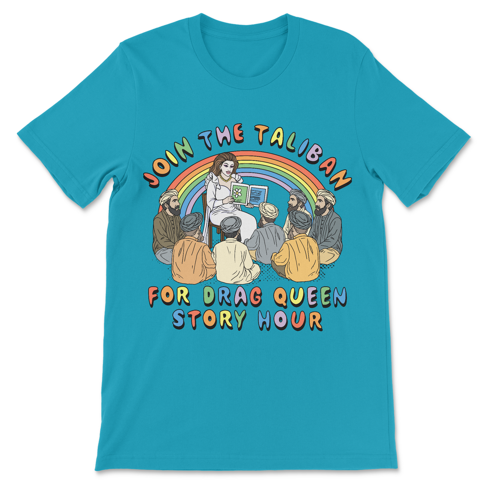 Join the Taliban for Drag Queen Story Hour is the ultimate political satire shirt. A confusing, offensive dark humor tee blending religious extremism and drag shows...if this doesn’t get you cancelled, nothing will.