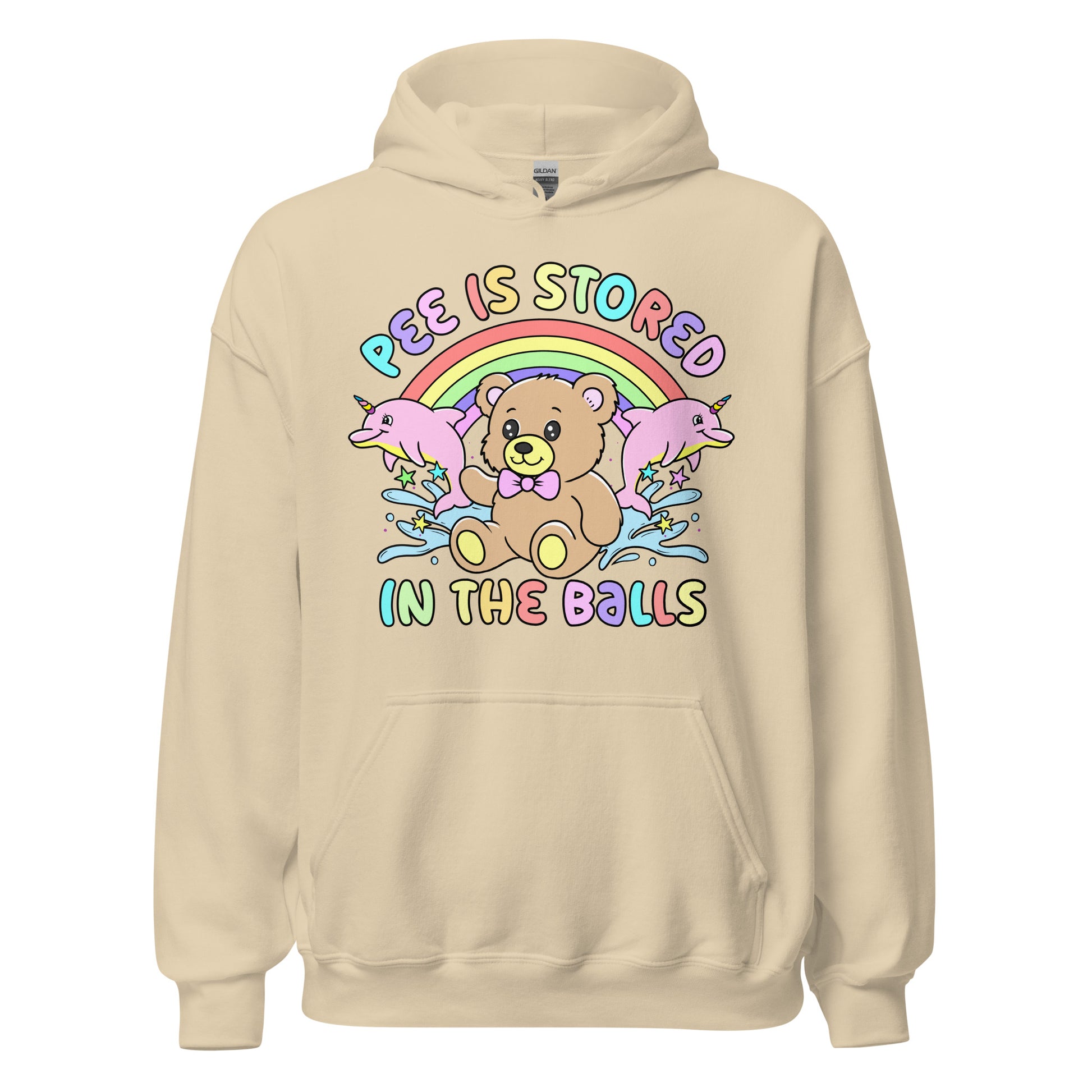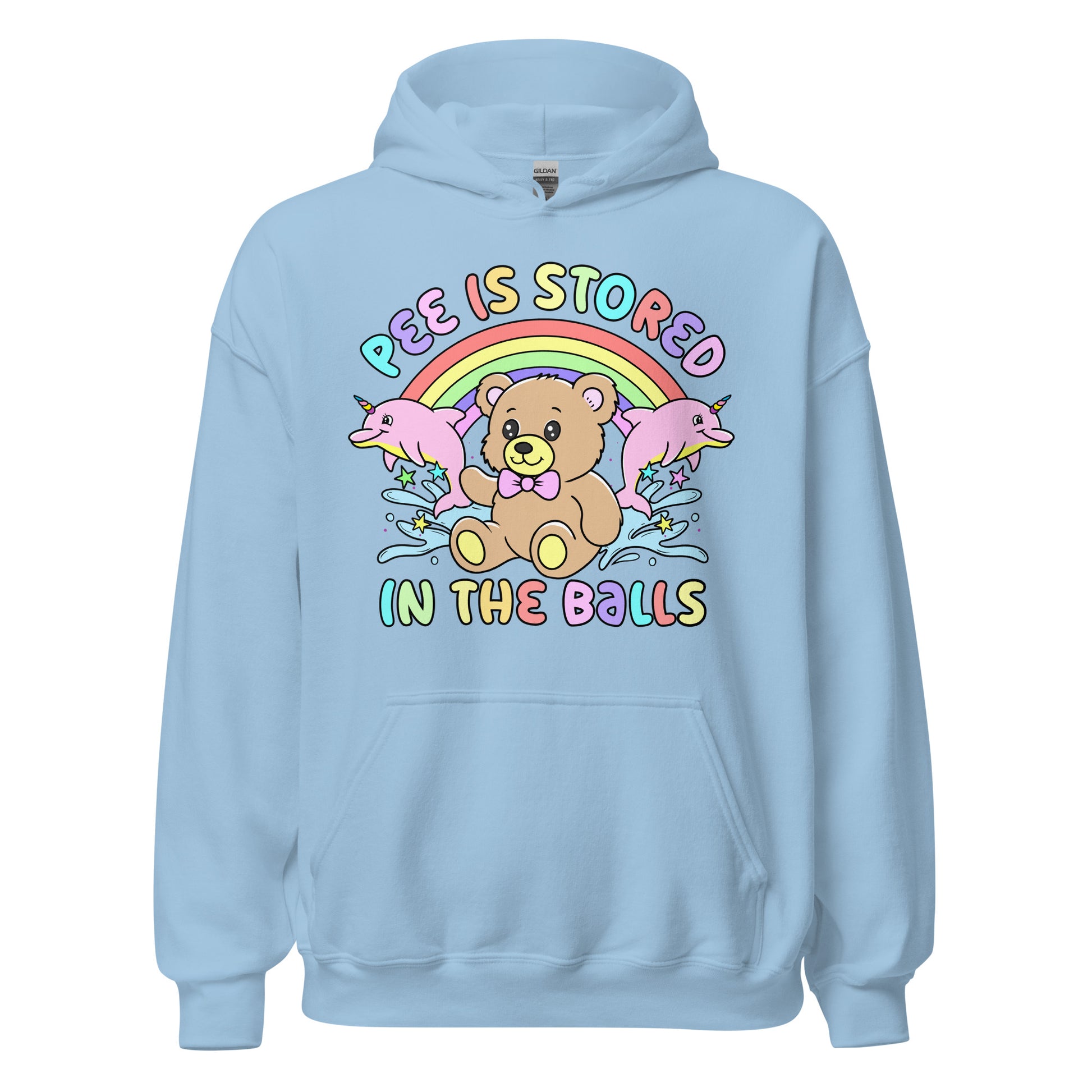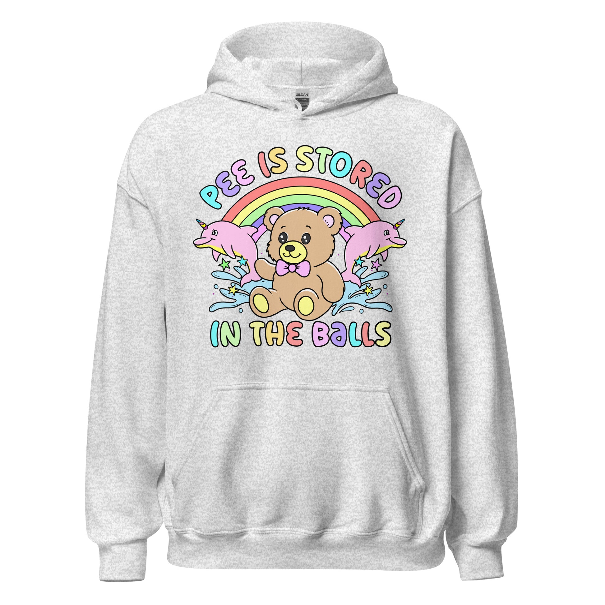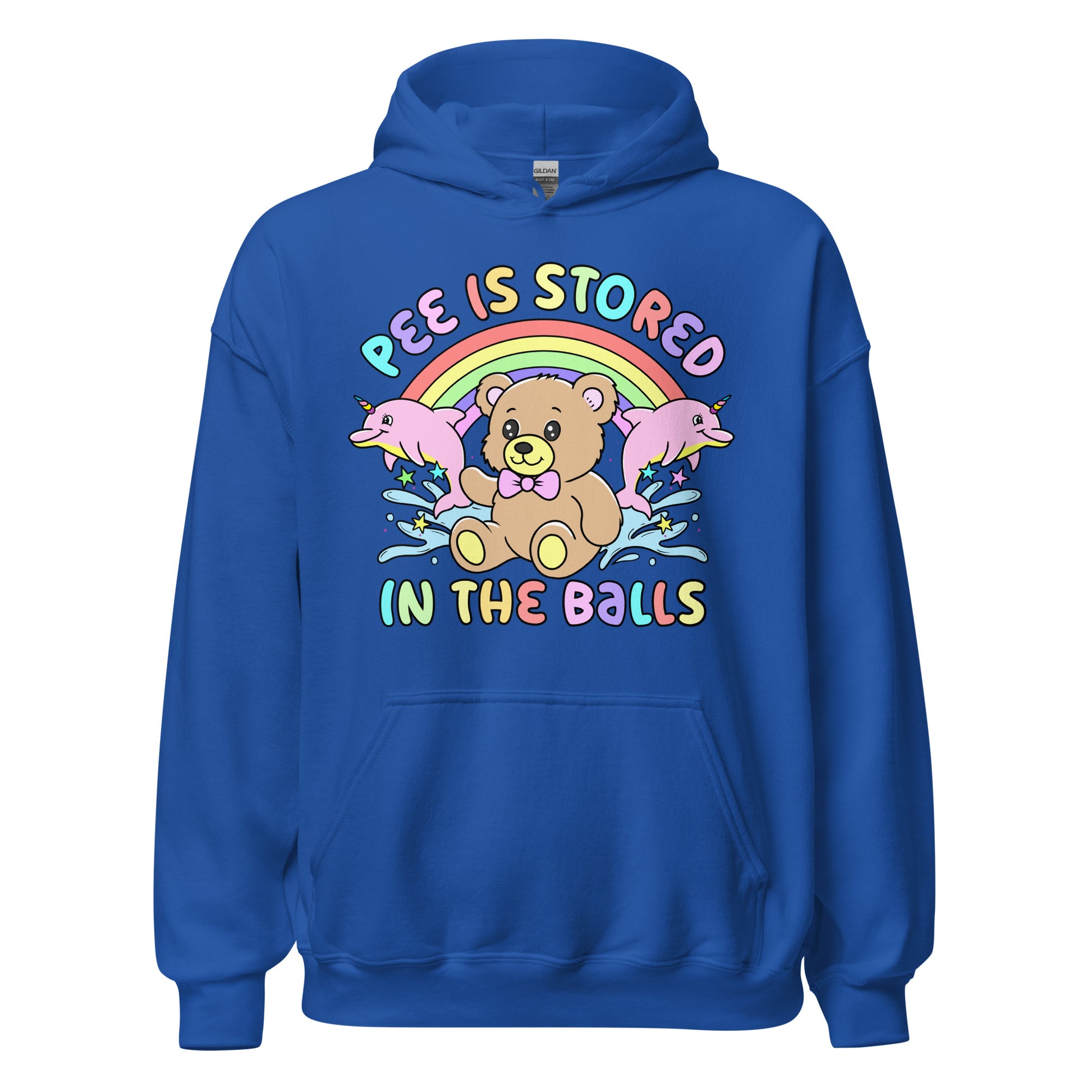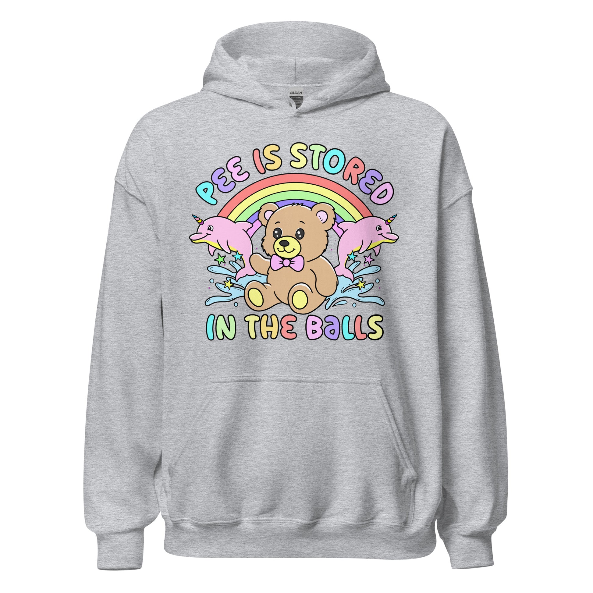 An offensive, vulgar graphic hoodie for anyone who loves bizarre, confusing, embarrassing humor. This inappropriate design turns the cursed meme “Pee Is Stored in the Balls” into a stupid-funny hoodie or sweatshirt you definitely shouldn’t wear in public.