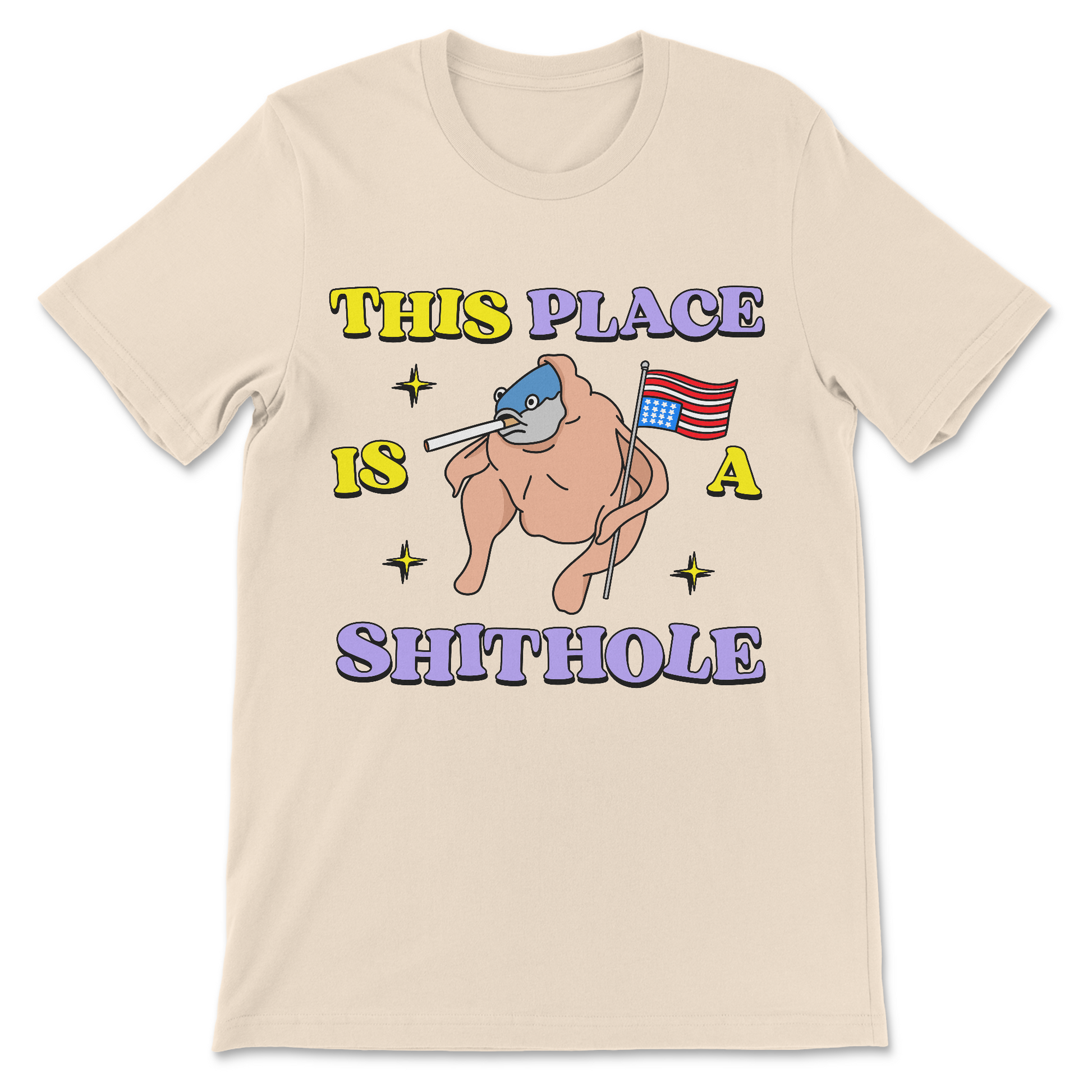 “This Place Is a Shithole” is a sarcastic USA tee for anyone who’s looked around lately and done the math.