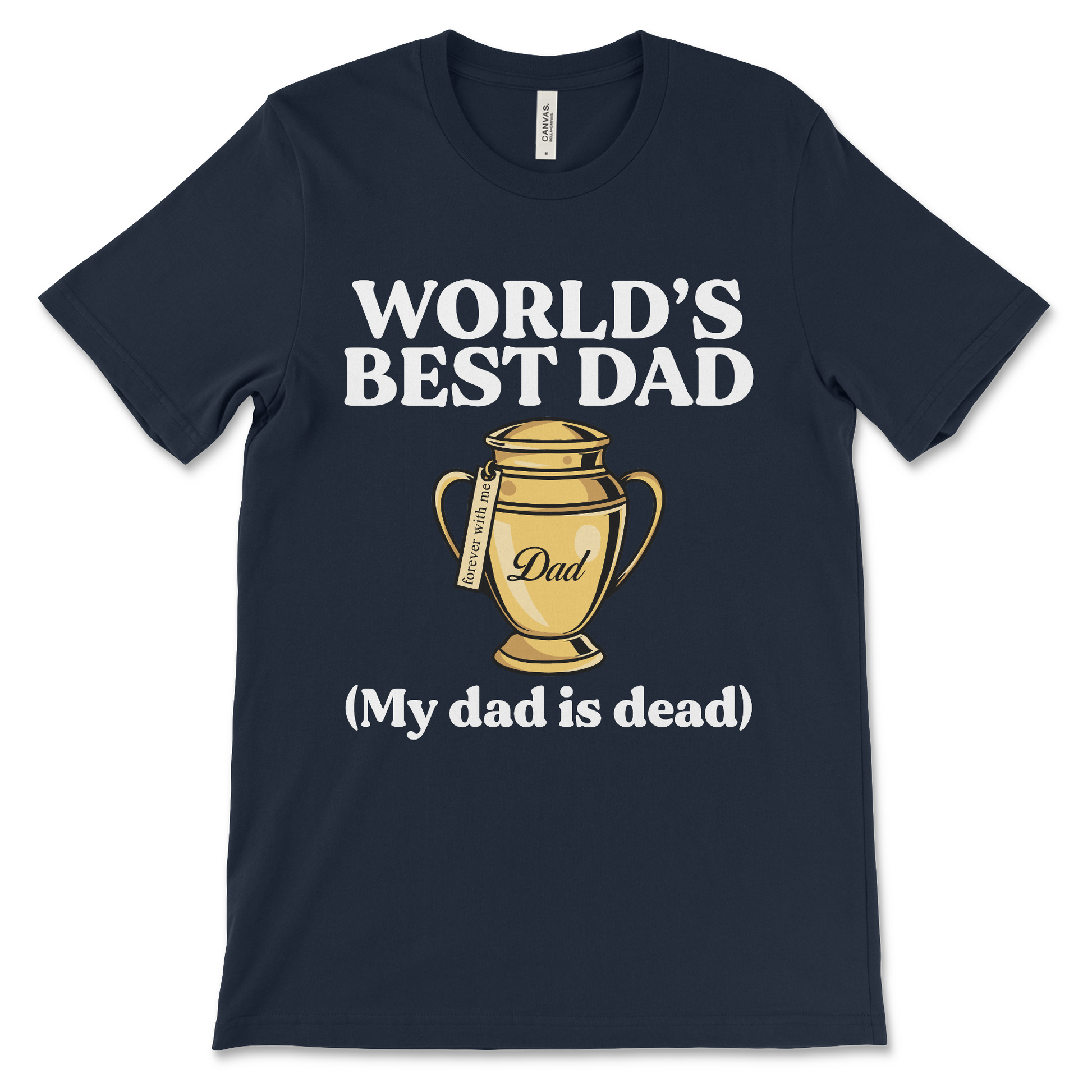 This funny, dark humor, and ironic shirt says World’s Best Dad (My Dad Is Dead), a perfect mix of sarcasm and emotional chaos. It’s the kind of design that makes people laugh, stare, or quietly question your upbringing. Equal parts offensive and absurd, it turns sincerity into a punchline that’s way too honest. Wear it when you want to confuse strangers, disappoint relatives, and remind everyone that irony is still alive and unwell.