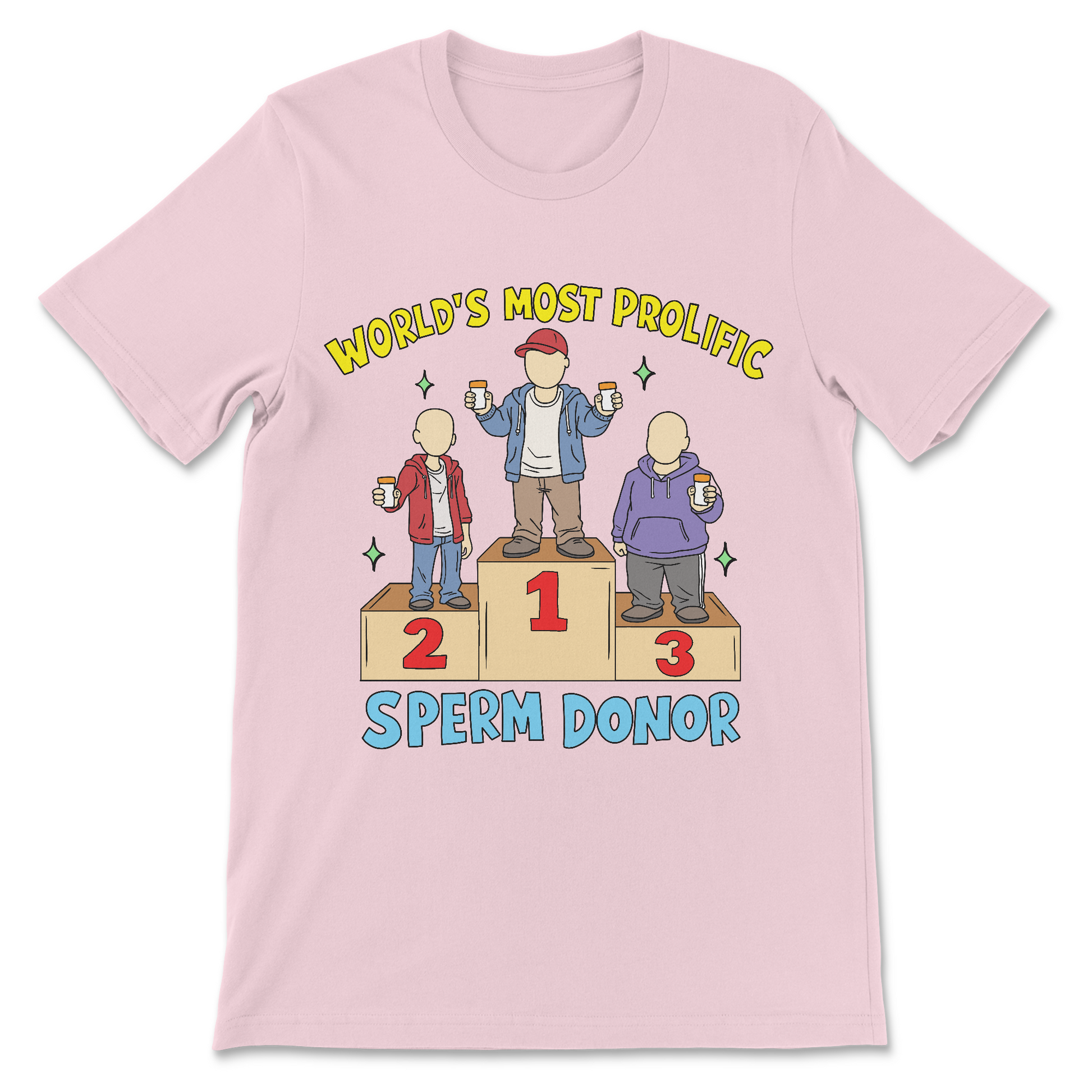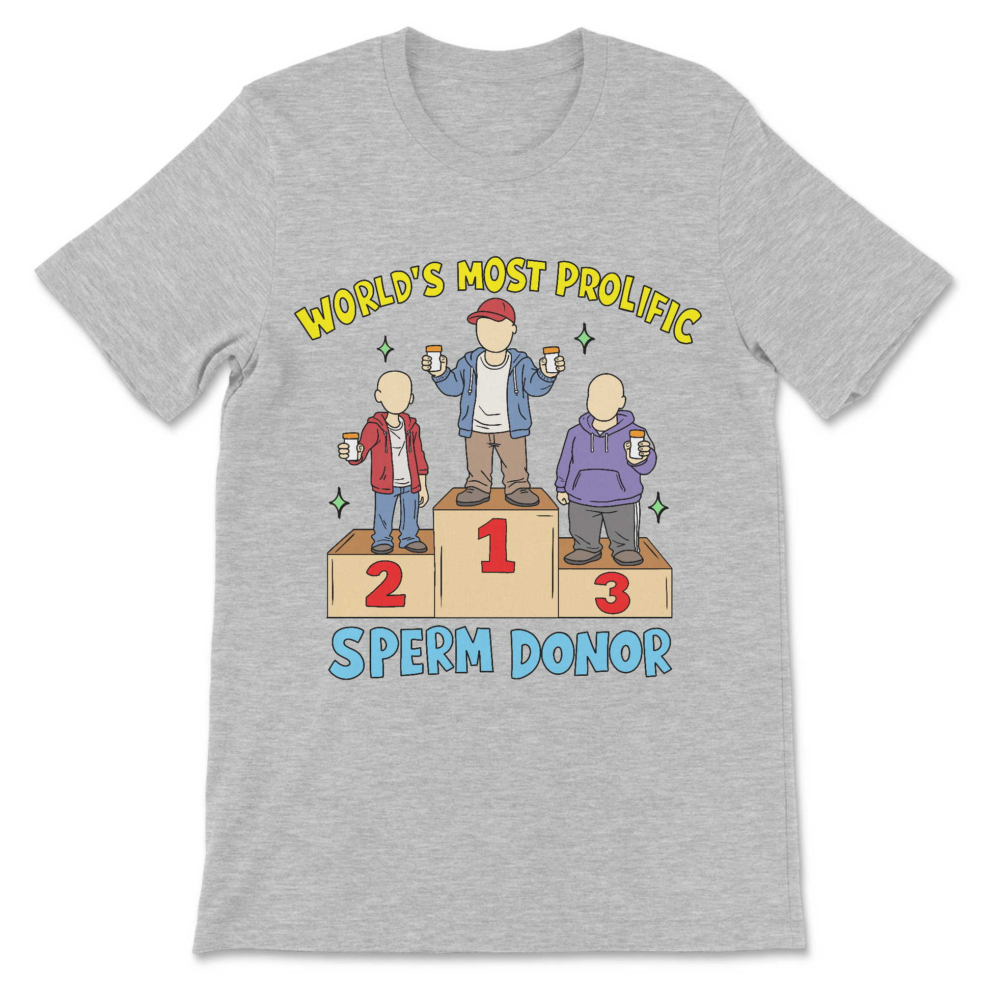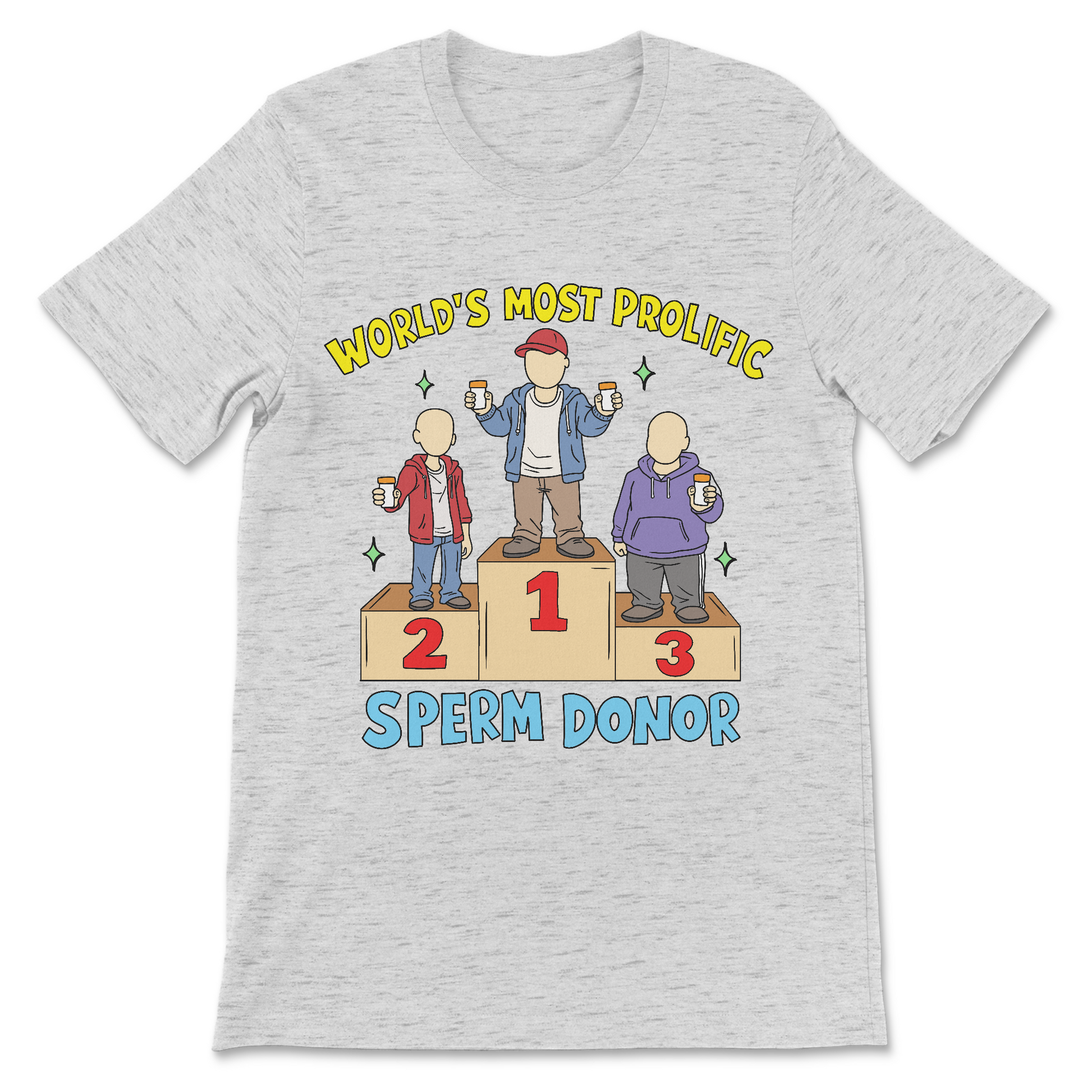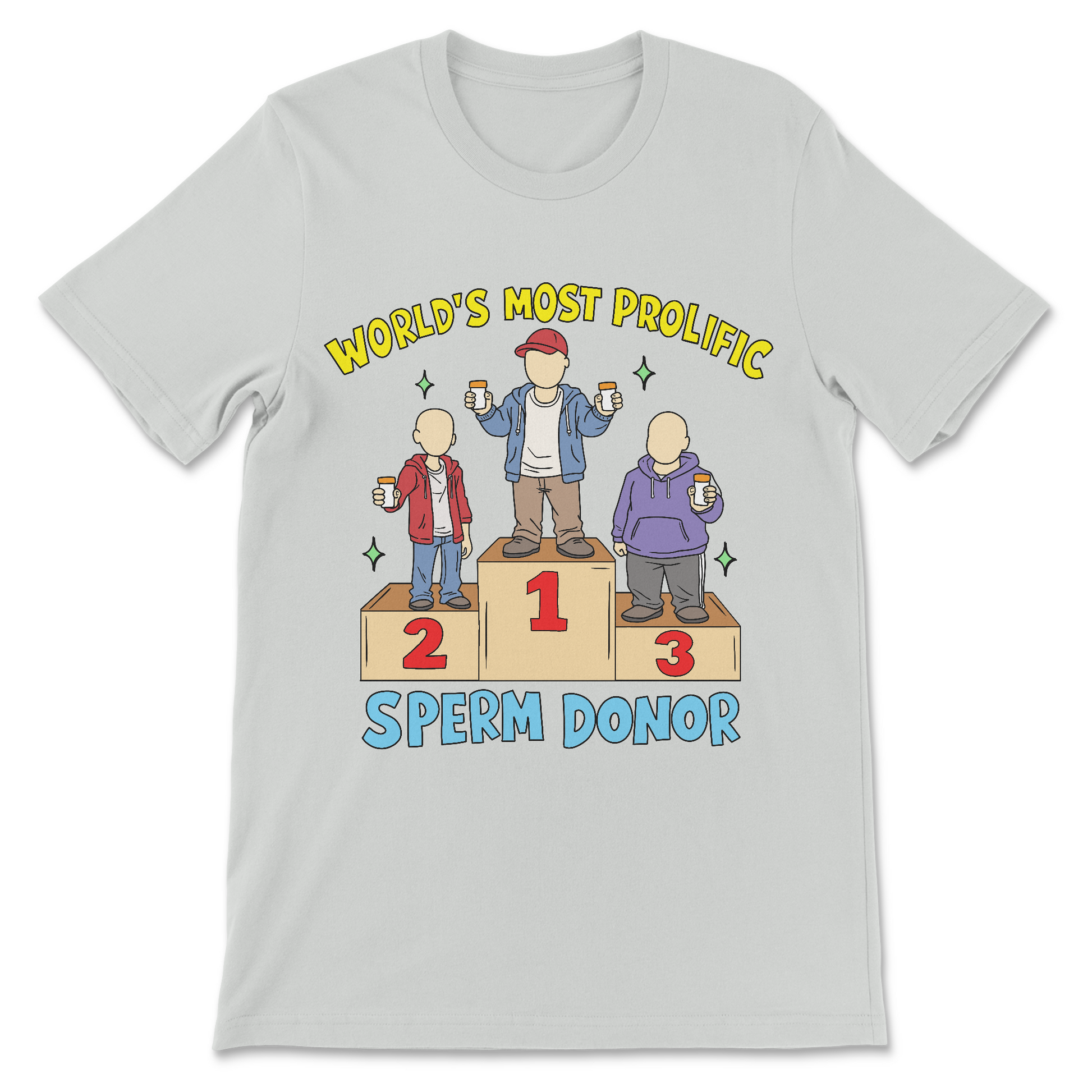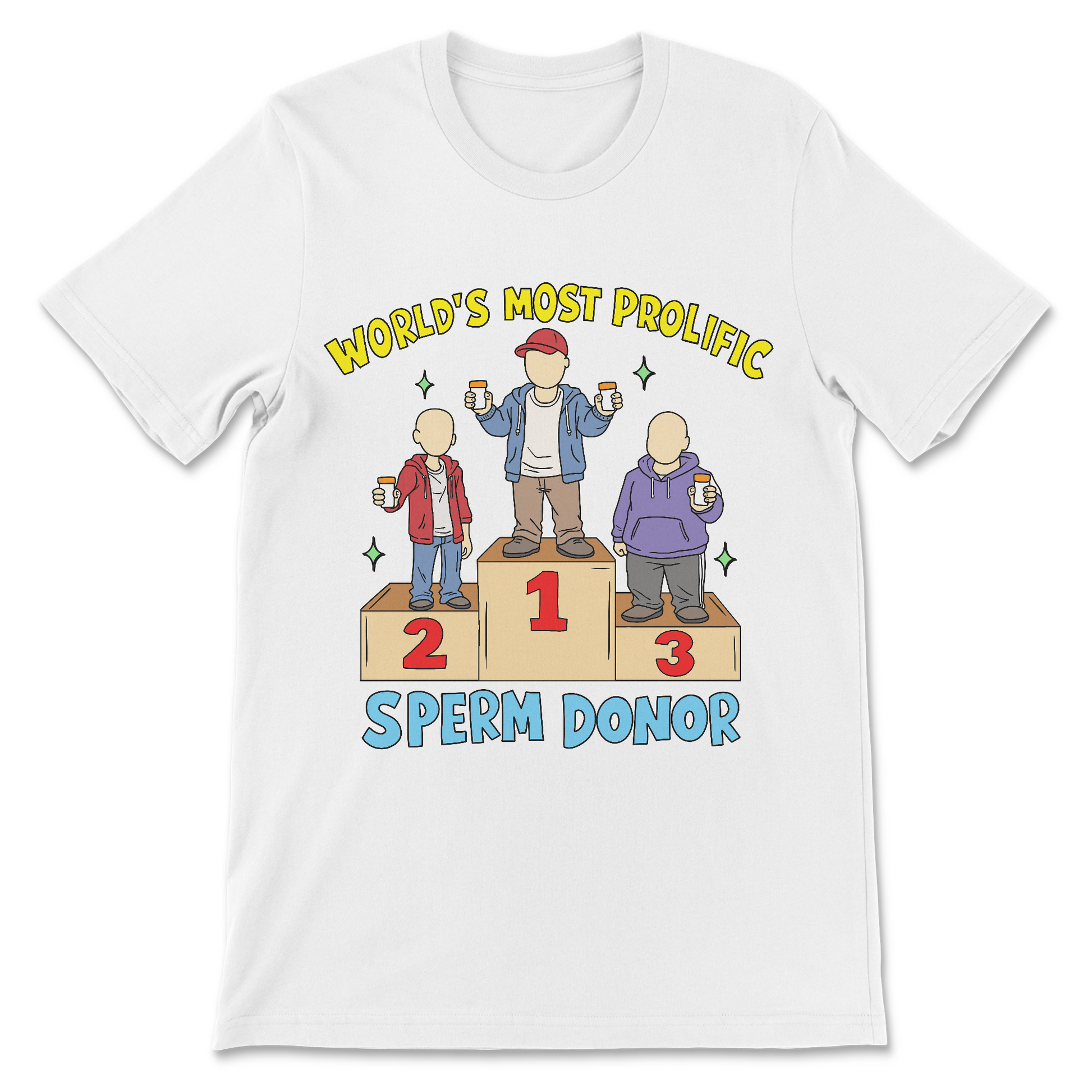 World’s Most Prolific Sperm Donor. Nothing clever, nothing explained, just an objectively insane thing to wear on a shirt. Reads once, ruins the vibe, moves on. An embarrassing t-shirt for the frequent donor.